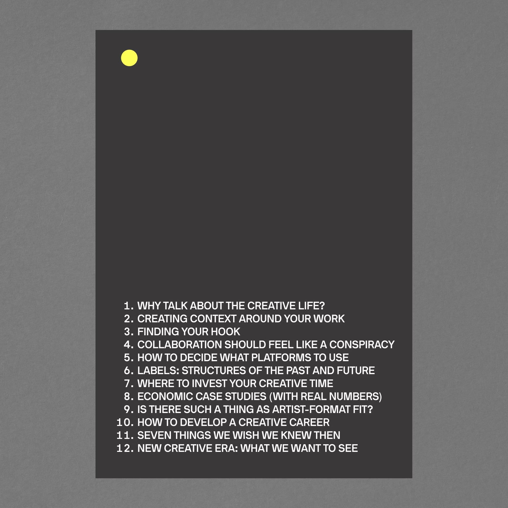 On the Creative Life: Conversations Towards a New Creative Era packages the transcripts of our dozen conversations into a practical, accessible MFA-in-a-box. Topics range from building context around your work to platform strategy to creative economics, all explained through real life examples and practical tips.
