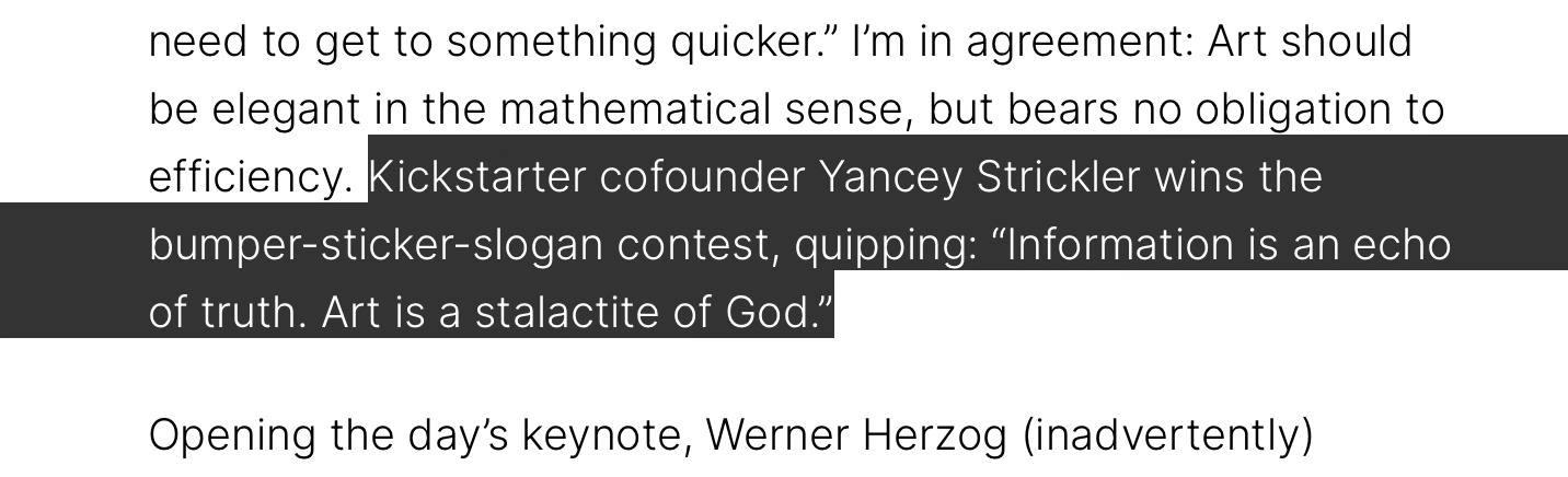 My hot take is that the feeling the artist has when they make the work and the feeling the audience has when they take in that work are the same thing. They are a physical property, a manifestation of the Oneness, a current of God in the real world. This is what I meant when I told Spike magazine that: “Information is an echo of truth. Art is a stalactite of God.”