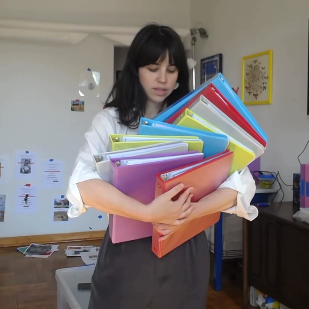 “The .zip folder is physically embodied as a *𝙪𝙣𝙞𝙦𝙪𝙚* artist publication,” Molly continues. “Files are printed and assembled to create a binder. Videos are broken down into frames. Old webcam portraits become 4x6 keepsakes. Glitter graphics are printed on transparency paper.”