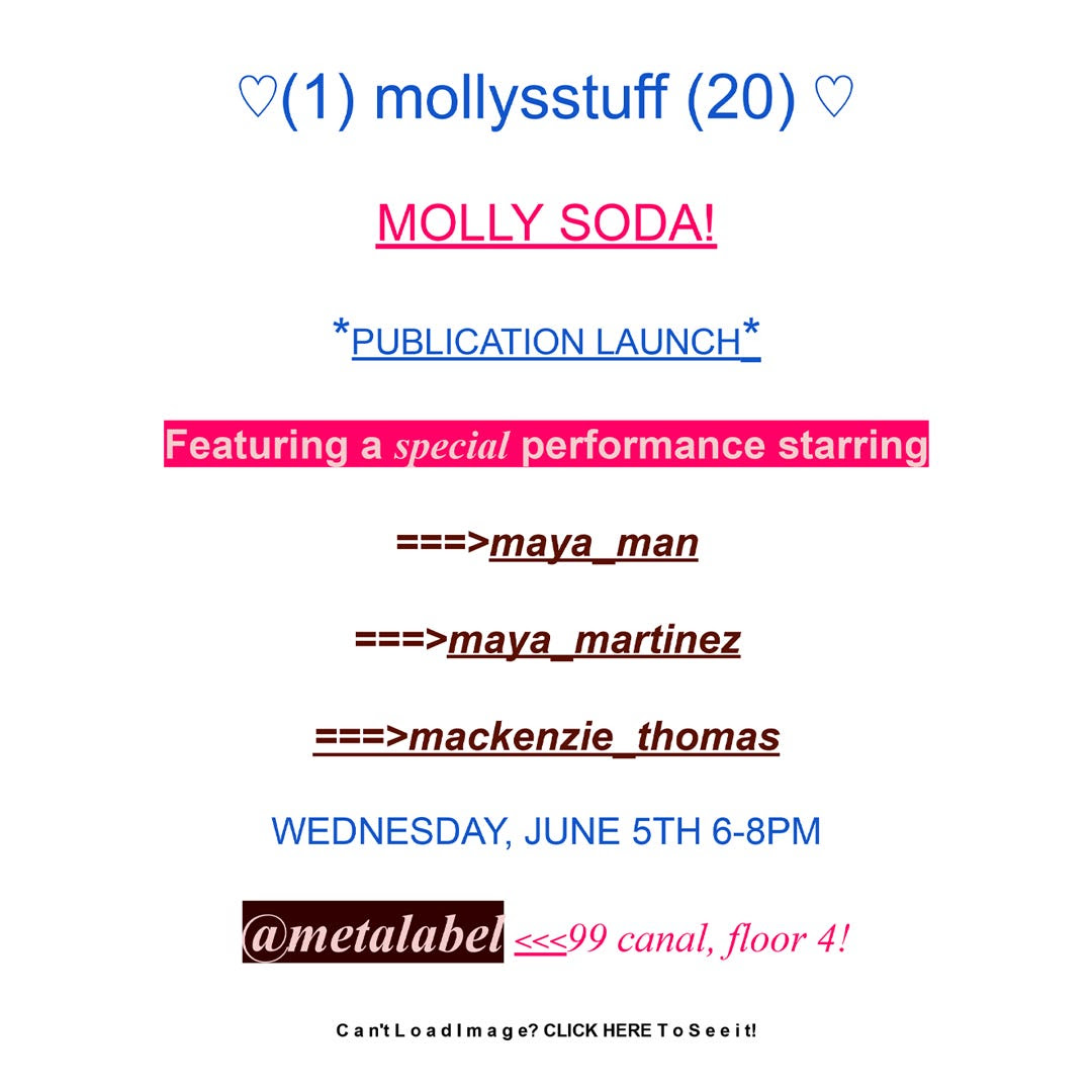 Molly Soda (b. 1989) is one of the most iconic and prolific digital artists of the 21st century. Working across a variety of mediums including performance, collage, and design, her work touches on themes of cyber-feminism, hyperstition, self-actualization, and the blurred boundaries between art and labor on the internet.