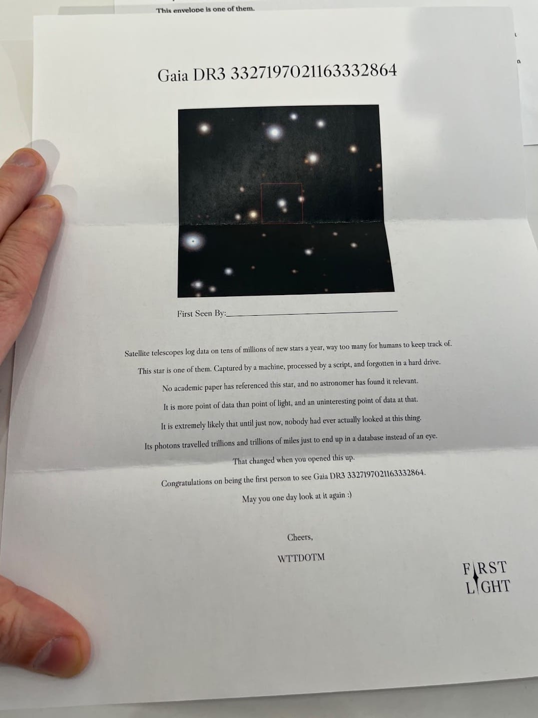 The second piece of paper includes more details about the star, including its size, general location, and QR codes that link to actual telescopic images. Here’s our dear Gaia DR33327197021163332864 in the flesh: