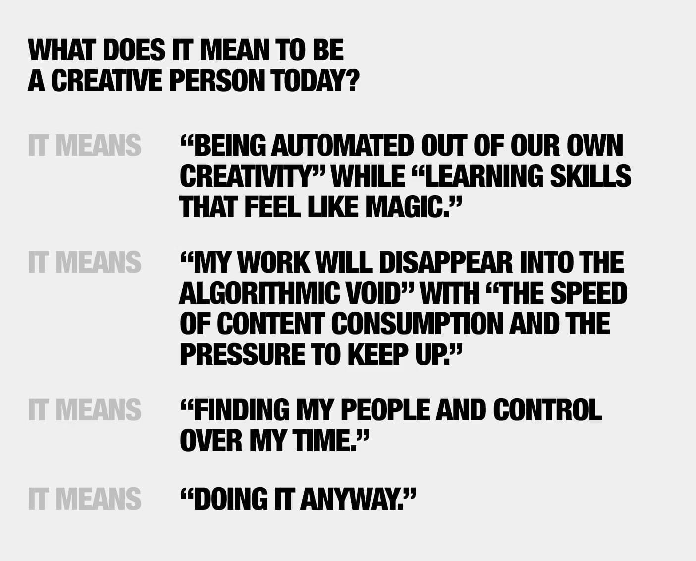 When we pored through the more than 300 responses to our request for thoughts on the state of the creative universe for this year's Anonymous Creative Futures survey, several clear themes stood out: AI. Dark forests. Challenging economics. A return to community and IRL.