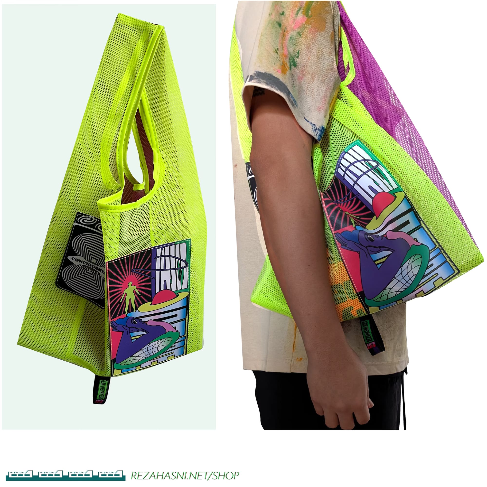 Reza Hasni is a Berlin-based, Singapore-born artist and designer whose work spans textiles, visual art, animation, and whose subjects bridge the digital, the symbolic, and the sacred. In their first release on Metalabel, Hasni releases “Cosmic Crumbs Bag,” a wearable and utilitarian piece of art in the form of a lightweight, colorful, and cleverly packable tote bag that hits all the right notes. Choice!