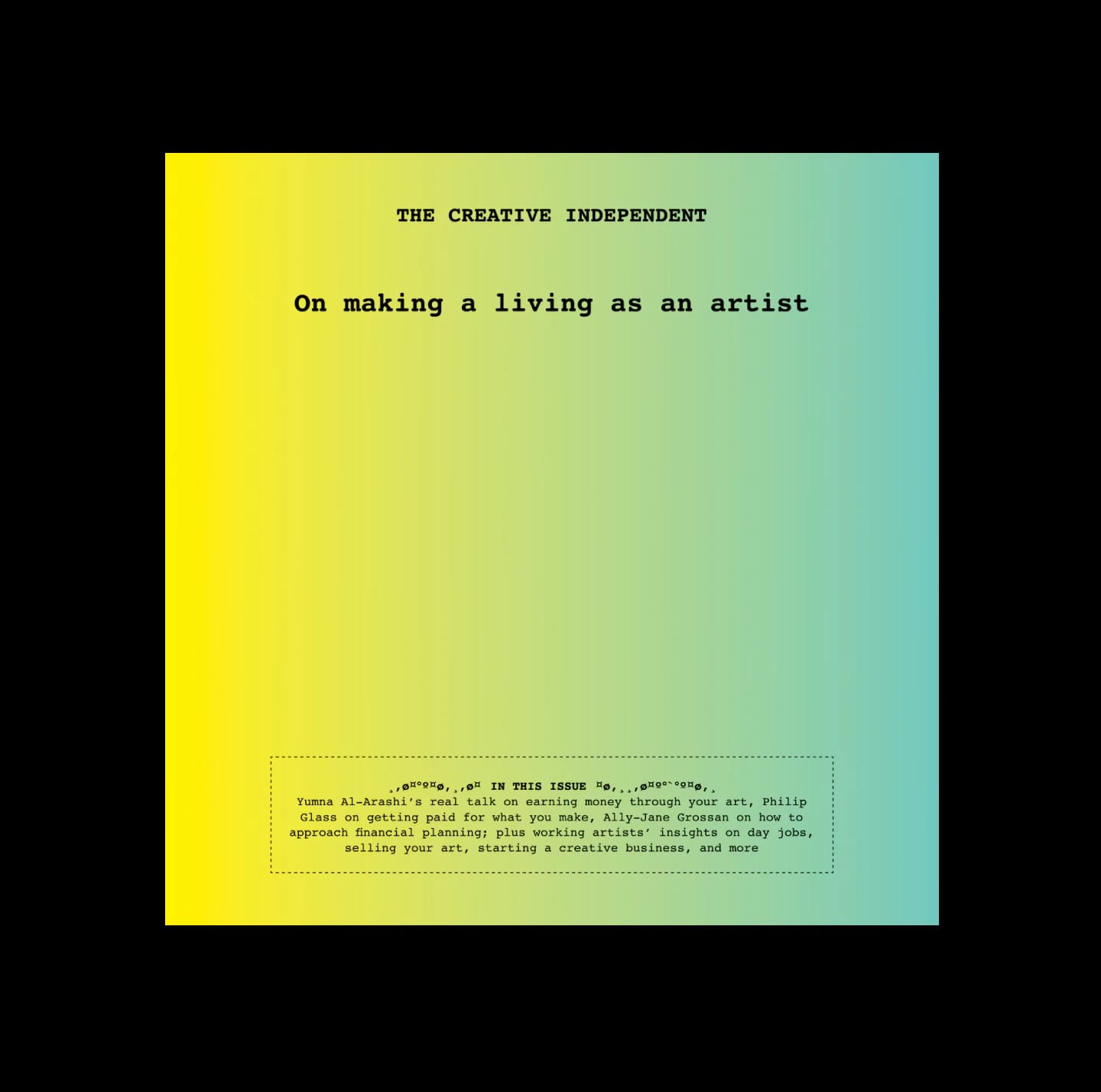 On Making a Living as an Artist (digital edition) by The Creative Independent —Last week’s Creative Independent drop of “On Making a Living as an Artist” sold out all 50 copies in hours, then sold out an additional 50 copies a few hours later. Not to worry. The Creative Independent has published a digital-only edition that’s free or pay what you want. Grab a copy now and stay tuned for more TCI releases on Metalabel in the future. (Support how you want)