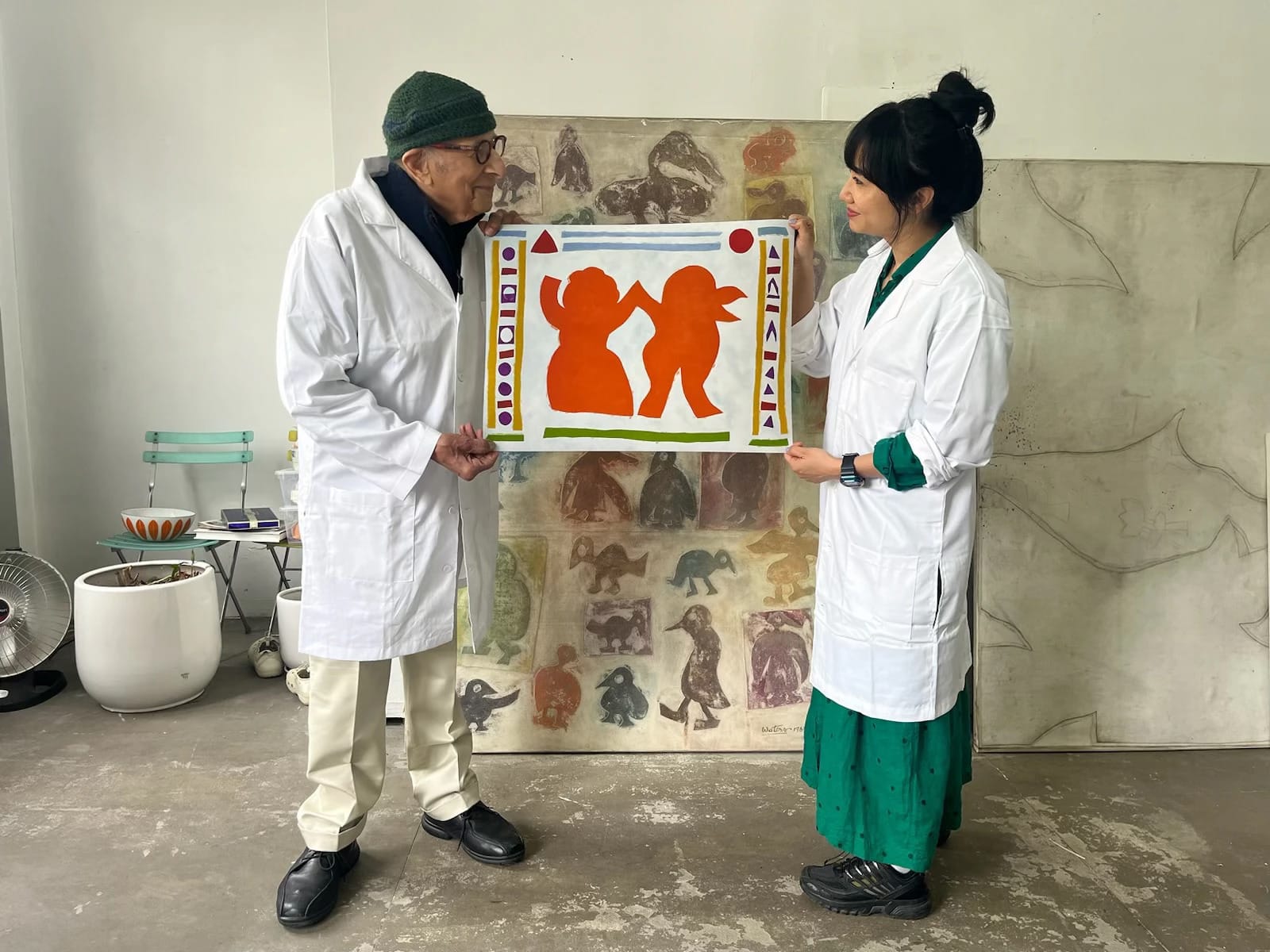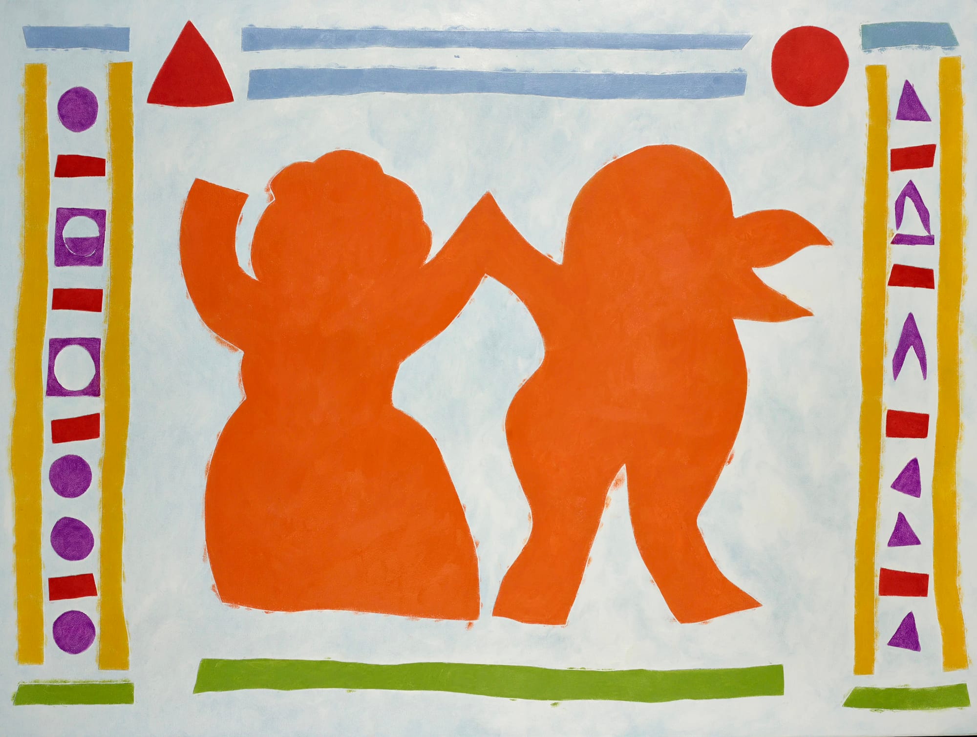 “Twins” is the first work made by the two artists together in the studio they share on the Bowery. It features The Dancer — a common figure in Kim’s work — and The Bird — a common figure in Waters’s paintings — in a loving dance that stretches across time.
