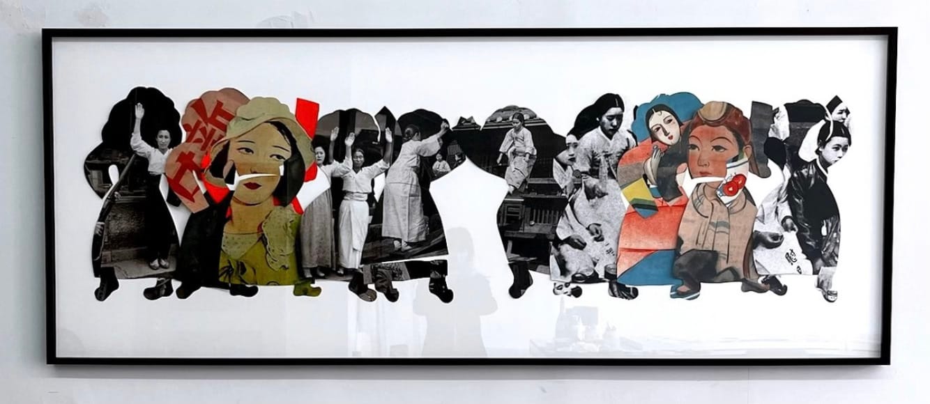 Jamie Nami Kim (born 1977) is a Korean-Canadian artist who also makes large, finger-painted and collaged canvases with vibrant colors and warm figures. Kim’s work explores ancestry, family, dreams, and “the thing that no one wants to talk about” dealing with the suffering of Korean women during Japanese occupation. Kim’s work turns these areas into colorful and surreal dreams, with a warm, contemplative, and welcoming tone.