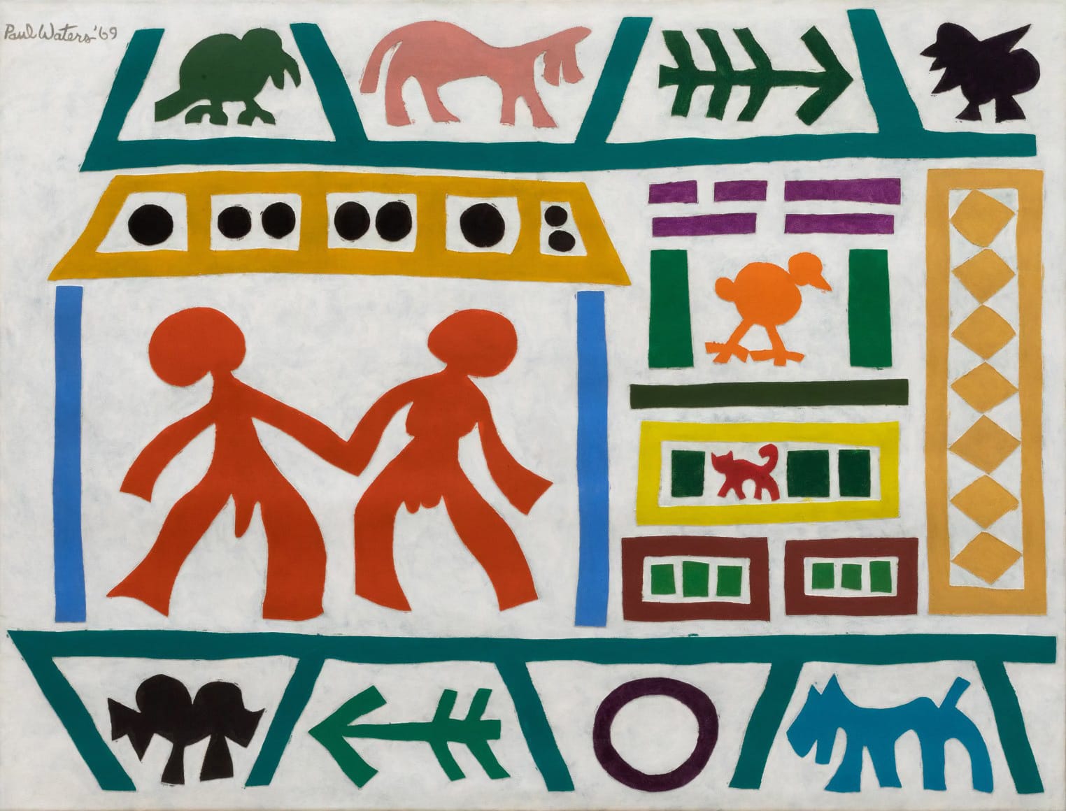 Paul Waters (born 1936) is an African-American painter who has created oil painting collages using hand-application techniques on the Bowery in NYC since the 1960s. His work’s fascination with shadows and symbols creates a timeless language and playful feel.
