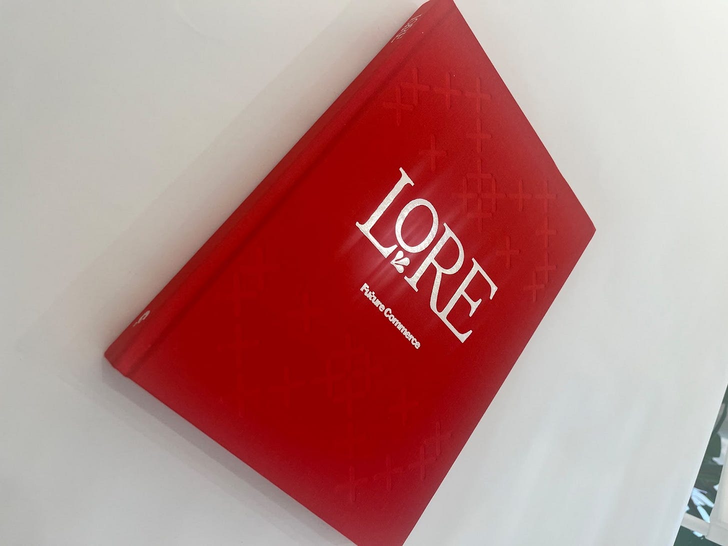 As an object, the first two things you notice about LORE are its cover — a beautiful woven red — and its weight. More than two pounds! Inside, essays from writers we follow — Kyle Chayka, Nick Susi, Amanda Claypool, Ruby Justice Thelot, Reggie James, Andrew McLuhan, among others — and clever inserts that tumble out as you turn the page.