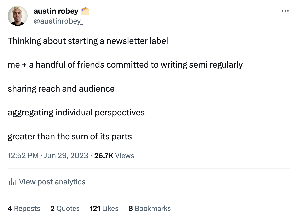 Within Metalabel, we consider to explore how we can continue to incorporate these ideas into our own creative practices. Last month Austin from the Metalabel squad posted an idea for a new kind of grassroots cultural club on Twitter: