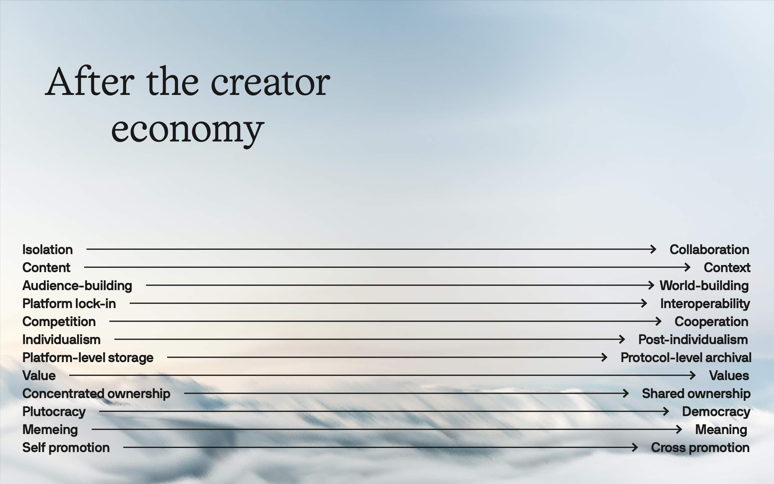 Earlier this year, we published two zines outlining an optimistic alternative vision for creative work: After the Creator Economy (Metalabel 006) & New Creative Era (Metalabel 008). Both publications call for new norms where creative people cooperate, collaborate, and form grassroots social and cultural organizations together.