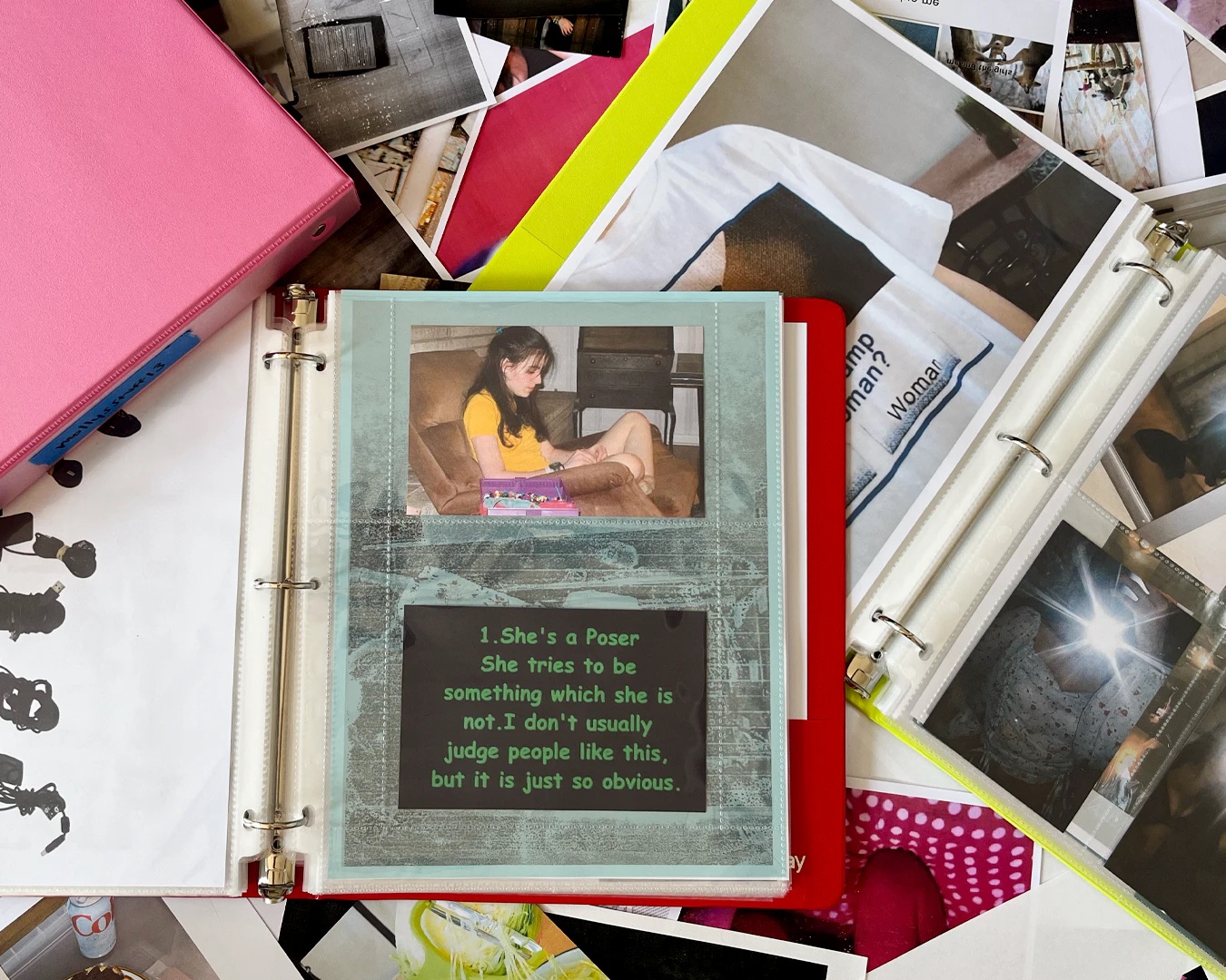 The play is set in the midst of a vision-boarding sleepover: three girls sit atop a messy collage of files, reading lines like, “Basically the whole Bible happens to me daily,” and, “I want to eat a moldy strawberry on purpose, go to the hospital, and then sue Whole Foods,” as they past girl-coded print-outs of Youtube screenshots and ballet flats onto the windows of 99 Canal.