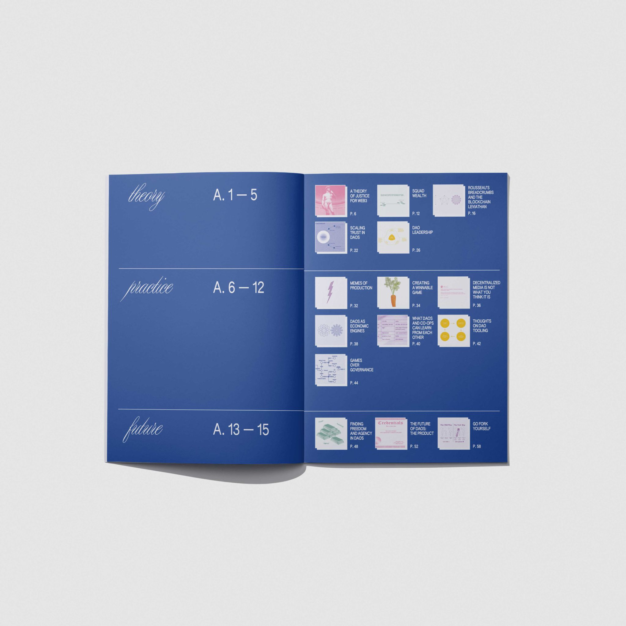 The zine, designed by Daniel Bromberg, highlights writing about DAOs in three sections.