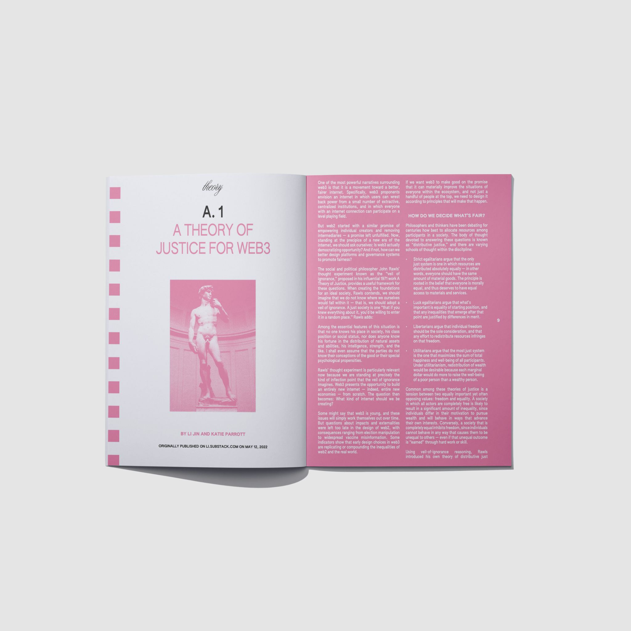 The publication highlights a curated selection of influential canonical writing on DAOs, and preserving them in print. Among the 21 writers collected in this anthology are Li Jin, Other Internet, Patrick Rivera, and more. All graciously agreed to add their writing to this work.