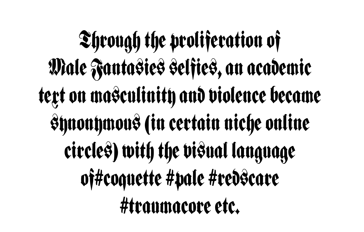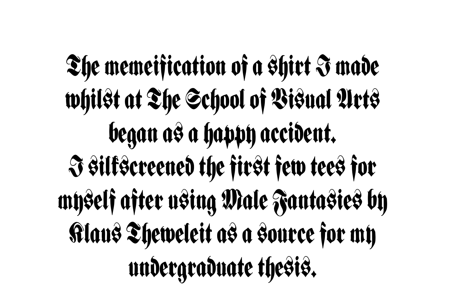 Maggie read Klaus Theweleit’s 1977 book, Male Fantasies for the first time in 2019 while she was doing research for her senior thesis at the School of Visual Arts. She ended up screen printing a handful of bootleg MALE FANTASIES t-shirts in the lab at SVA, first for herself, then for her friends.