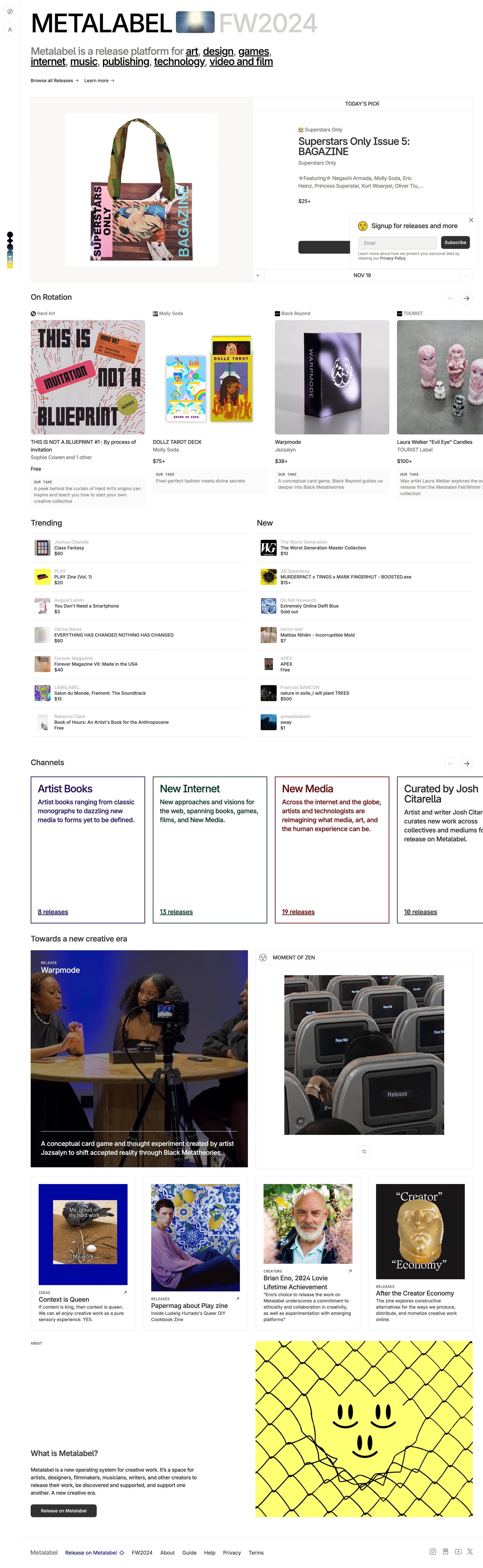 As the builders and stewards of Metalabel, we’ve had front row seats to everything going on. With a new homepage that we’re introducing today, we’re making it so everyone can see what a New Creative Era looks like in practice.