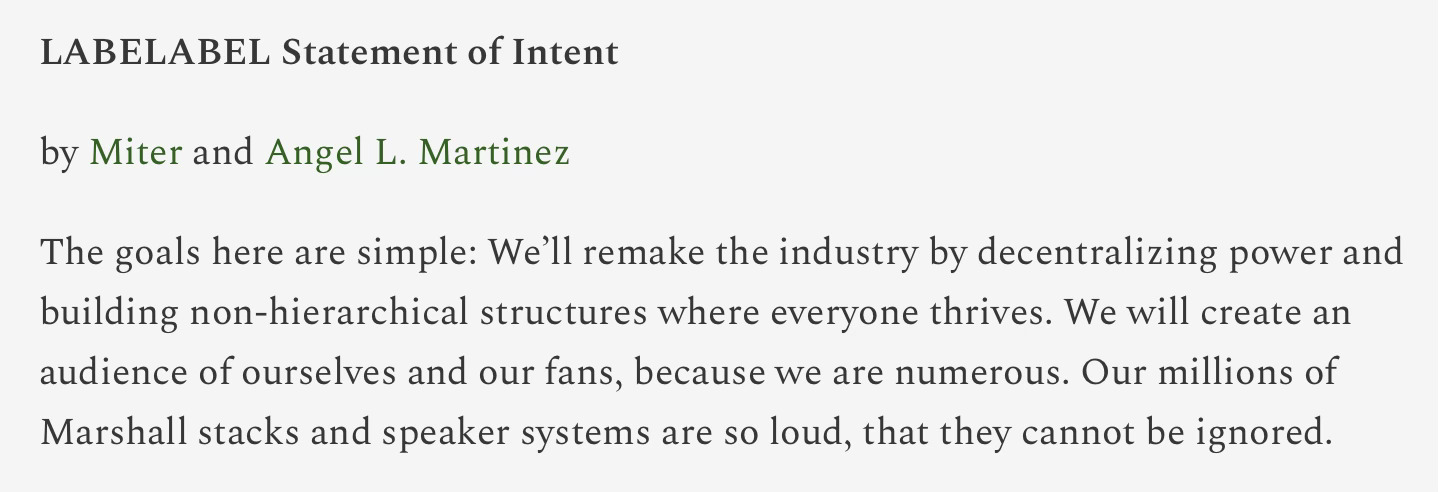 I quickly discovered that there were indeed people releasing music similarly via the Substack network. I came up with the idea of a "record label" as a way to create collective support and connect with other musicians. The idea was about building solidarity through community and music without ownership. It is largely about self-autonomy and mutual support and almost antithetical to the idea of a record label — but still calling it a record label...mainly for fun.