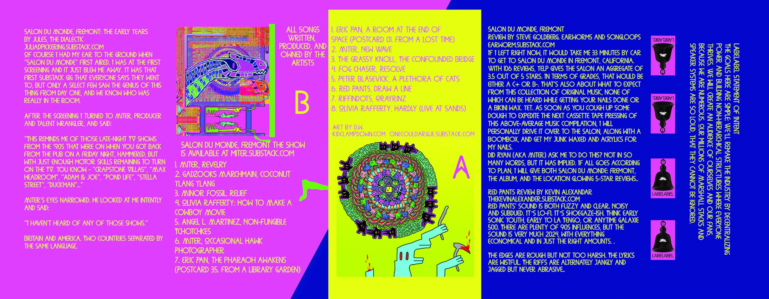 Miter: The release is a soundtrack album featuring artists participating in a Substack-based music video/variety show called Salon Du Monde, Fremont. It’s a physical cassette that doubles as a zine with writing and art, as well as a download of the album.