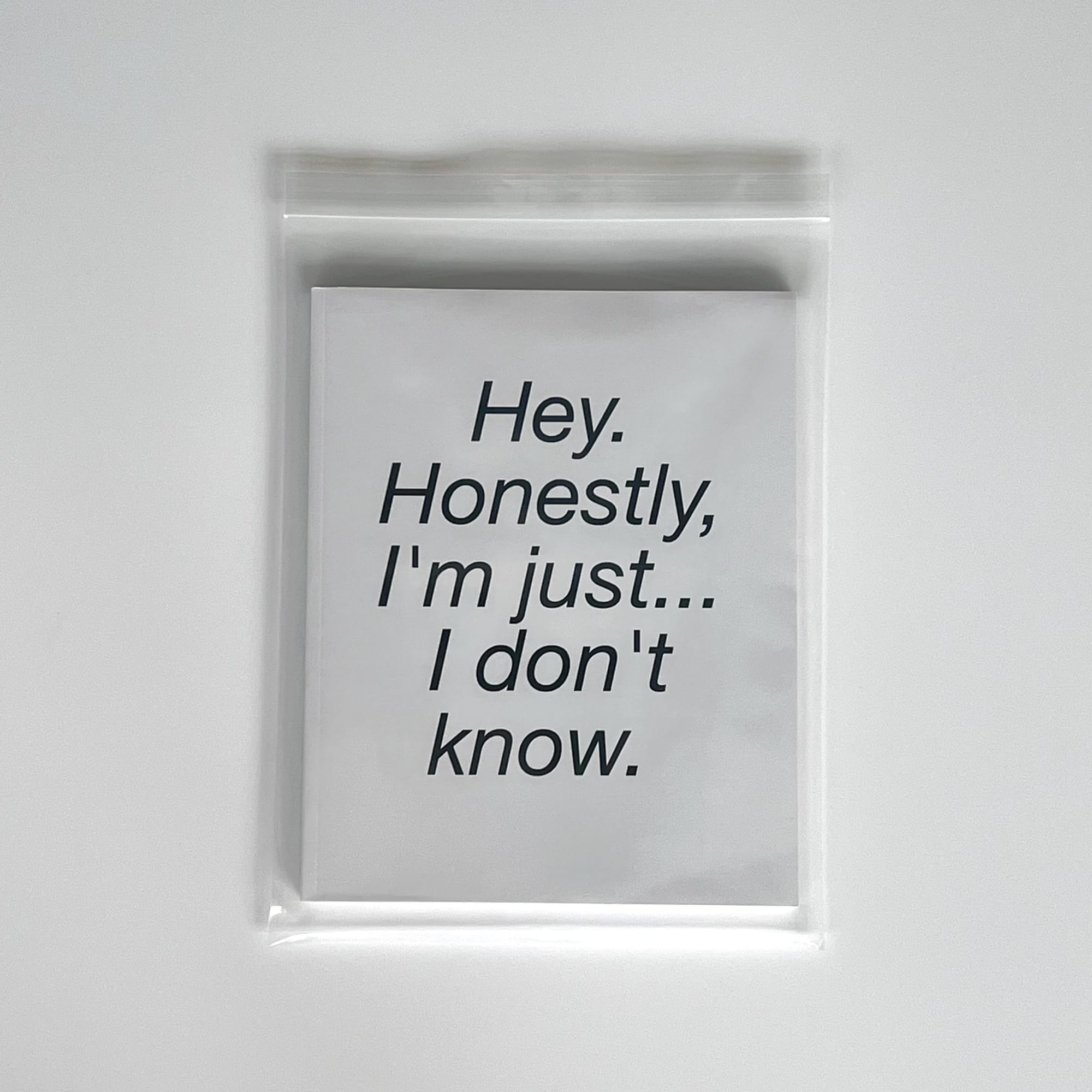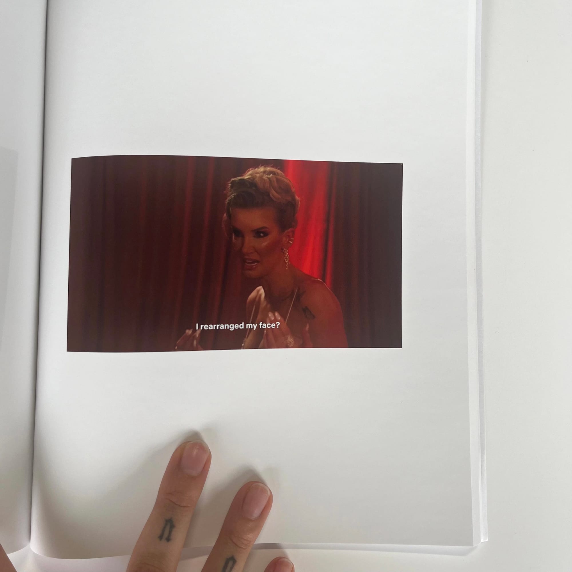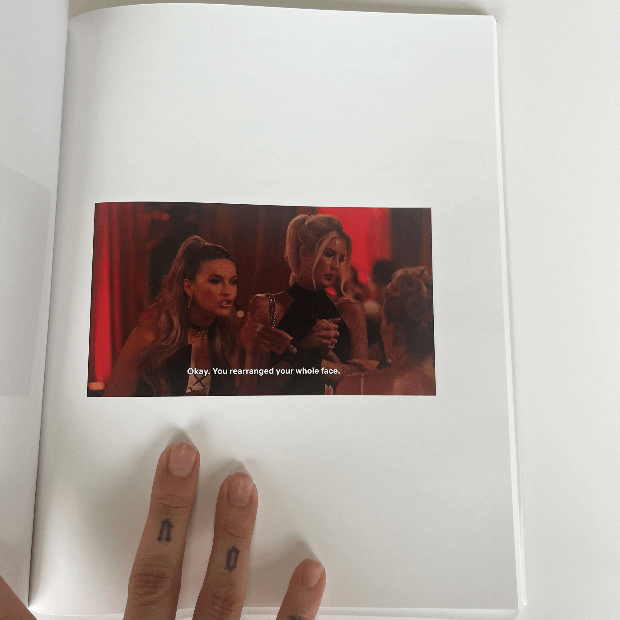 Hey. Honestly, I'm just...I don't know. is a small-run book by the artist Zarina Nares that sequences still images from the reality TV show Selling Sunset into a commentary on how women target each other’s insecurities when expressing anger. Only a few of the limited run of editions remain.