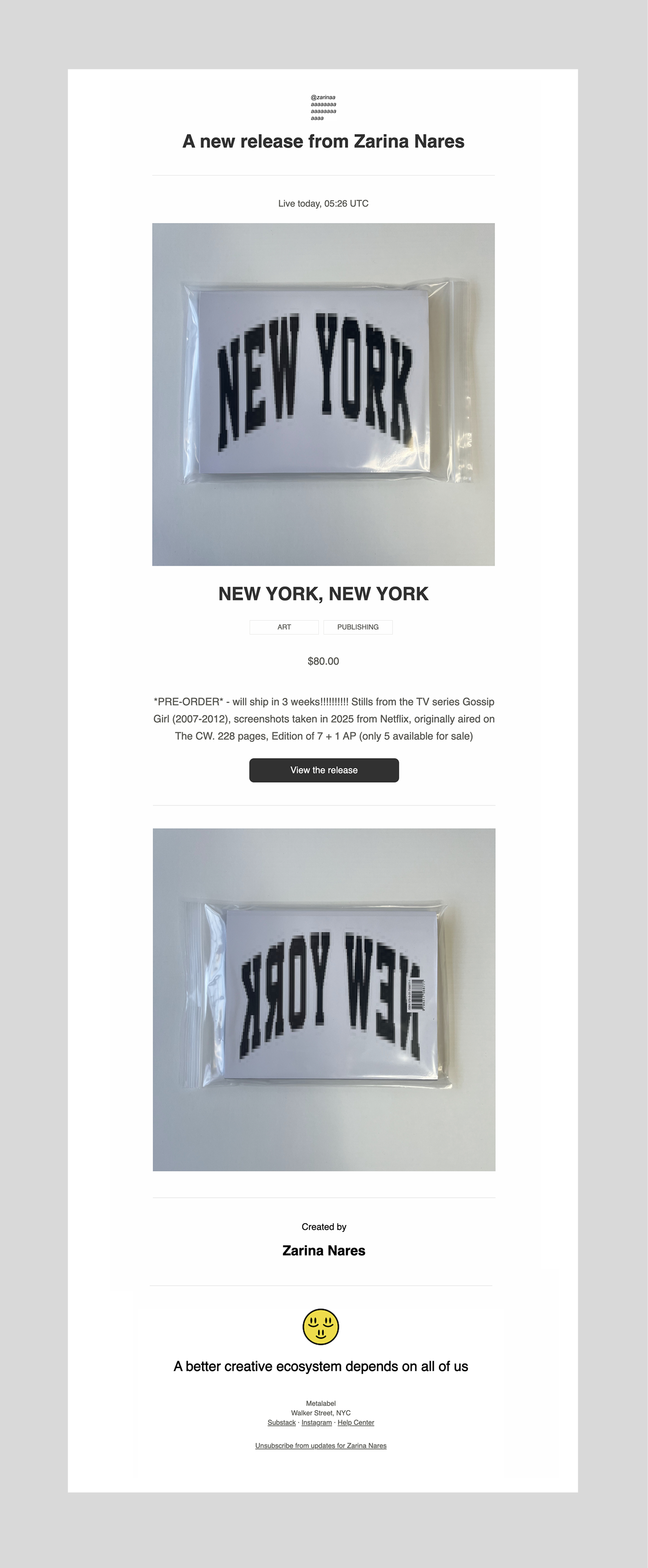 When someone collects your work or follows you on Metalabel, they join your release list. Each new release arrives in their inbox in a deliberately formal design, almost like a museum placard: title, label, artists, release date, and short description, all automatically generated from your release.