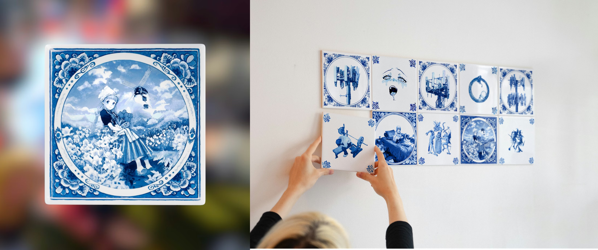 What it is: Traditional Dutch Delft tiles reimagined with feverish internet memes and conspiracy imagery.
