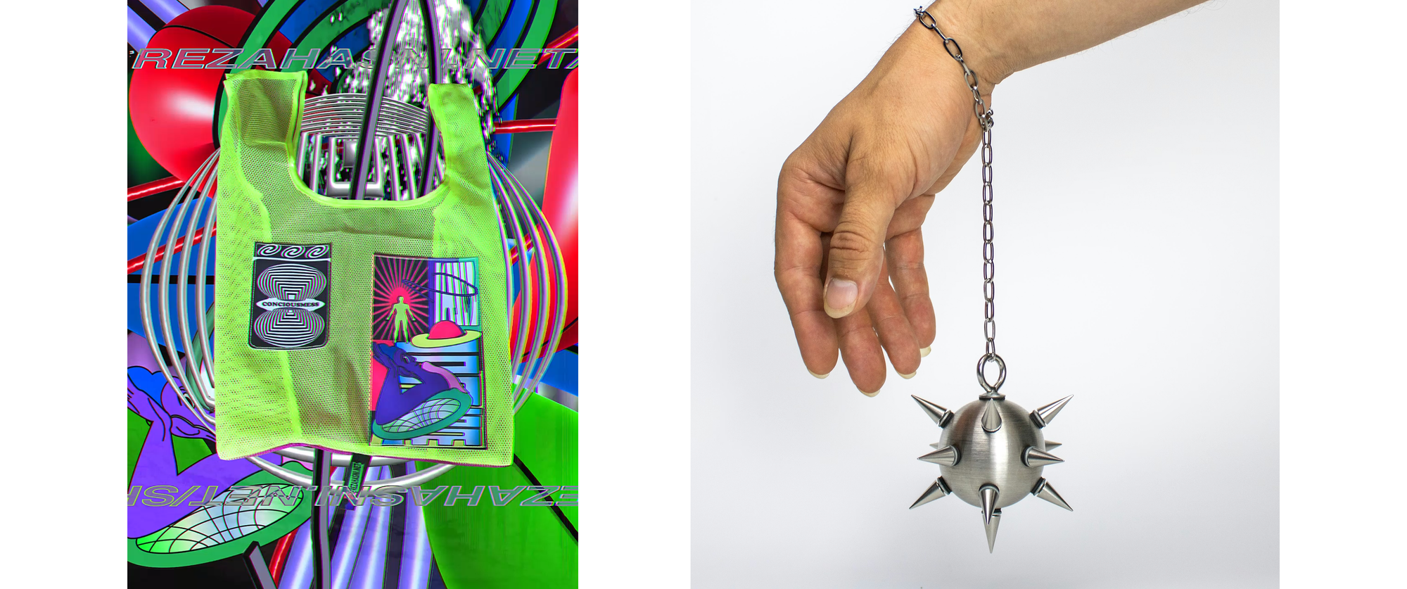 What it is: A neon-green tote bag covered in digital-sacred symbolism from Berlin-based artist Reza Hasni, and a bracelet that reimagines medieval weaponry as wearable art.