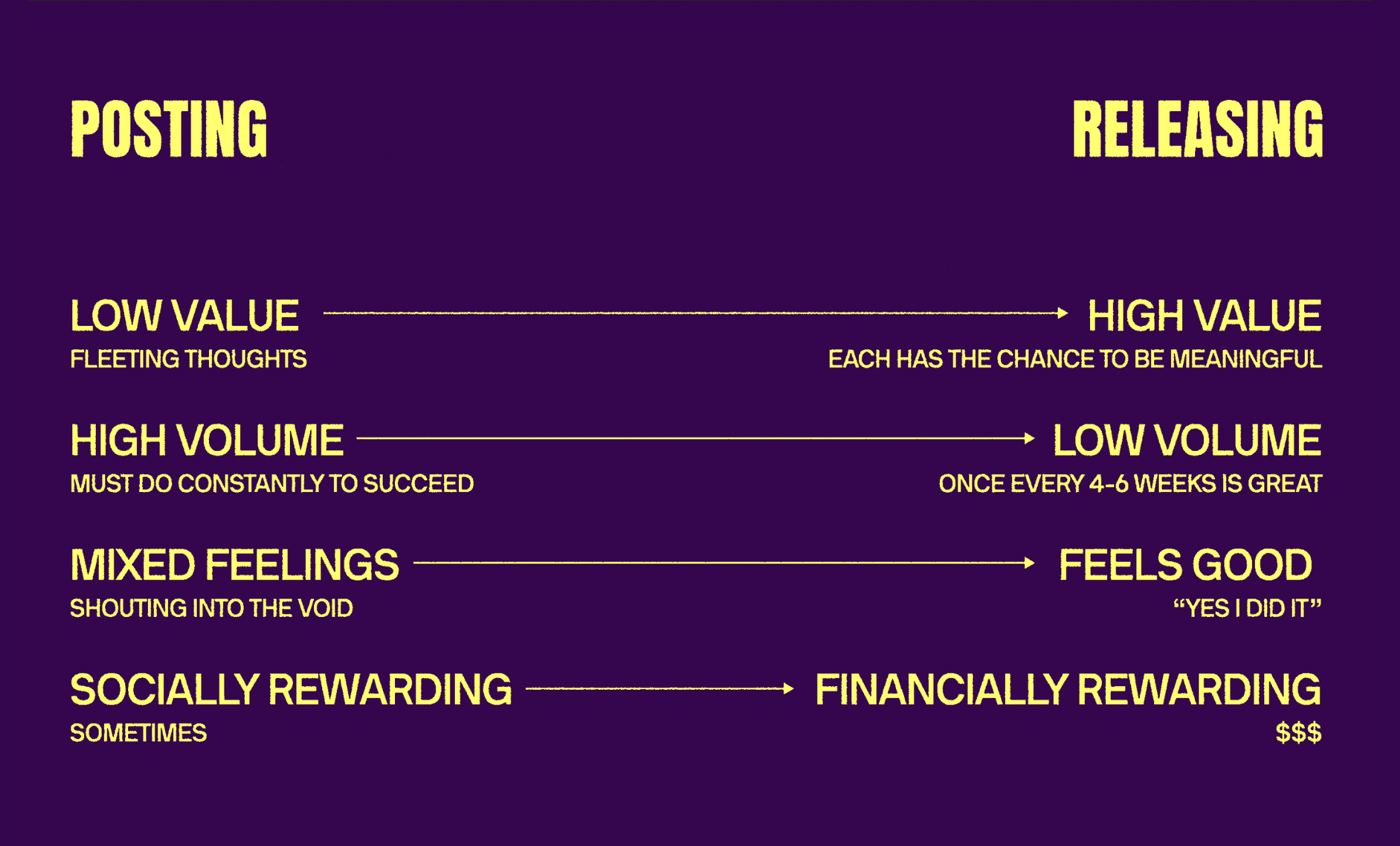 Posting is how creative people have shared work for the past decade. Releasing much more enthusiastically celebrates creative work.