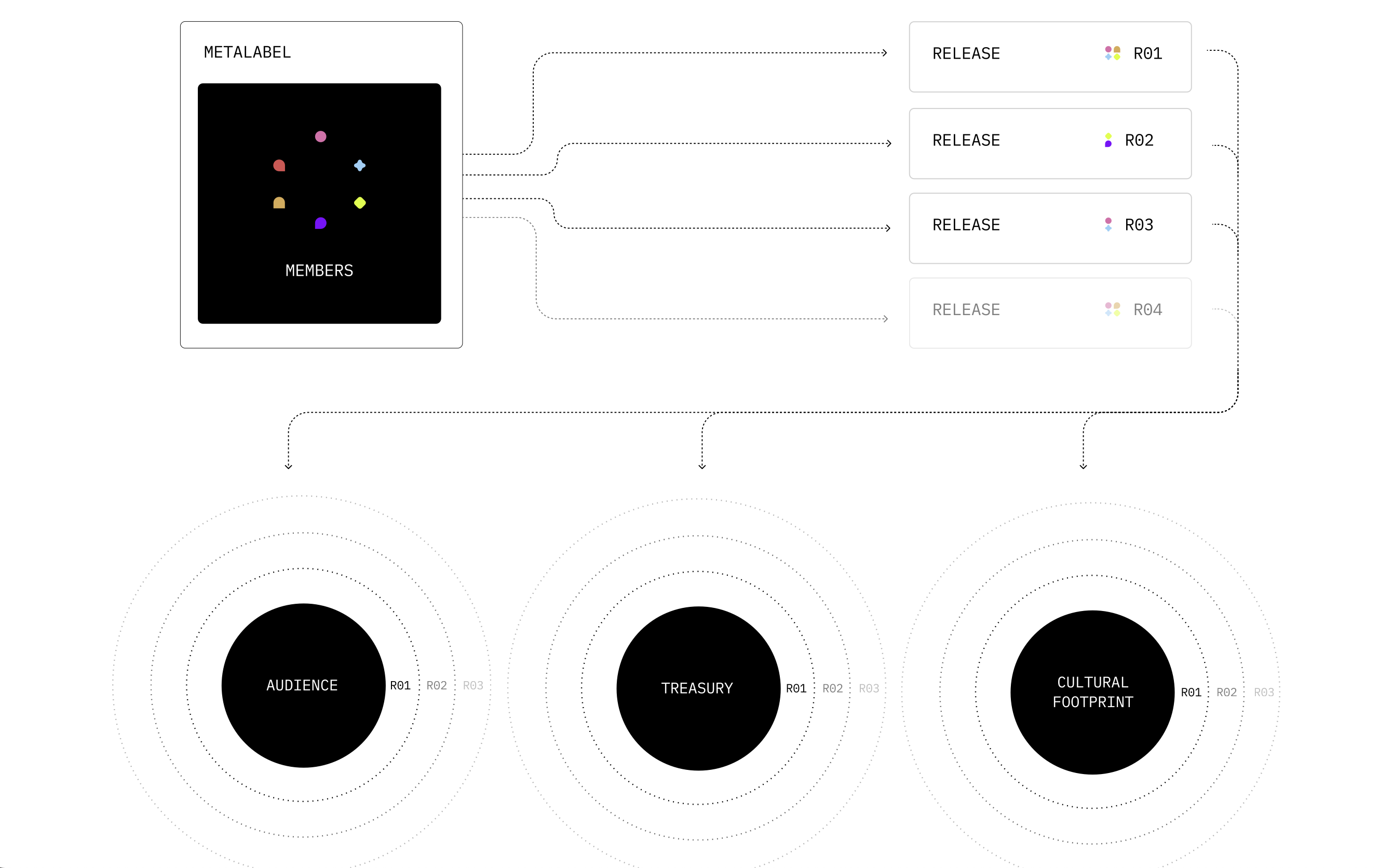 4) The metalabel model is a sustainable engine for cultural and economic growth. We’ve designed the upcoming Metalabel.xyz to default to split proceeds 70-30 between the creator of a record and the metalabel publishing it (this can be changed). This structure allows for each metalabel’s release to generate income for the creators of the work, as well as return funds to the metalabel’s treasury that can be used for upcoming works. This iterative, accumulating structure allows a metalabel to sustain and grow their cultural movement and resources over time, as this visual from the “What’s a metalabel?” page illustrates: